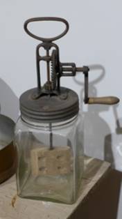 Ici ma baratte, s’Blotzfassel, ou Butterfassel, avec laquelle, une fois par semaine, je fais du beurre à partir de la crème délicatement prélevée sur le lait de nos vaches. Elles produisent suffisamment de lait pour notre consommation familiale. Certains jours je peux même en laisser cailler et égoutter pour faire du Bibeleskaas.